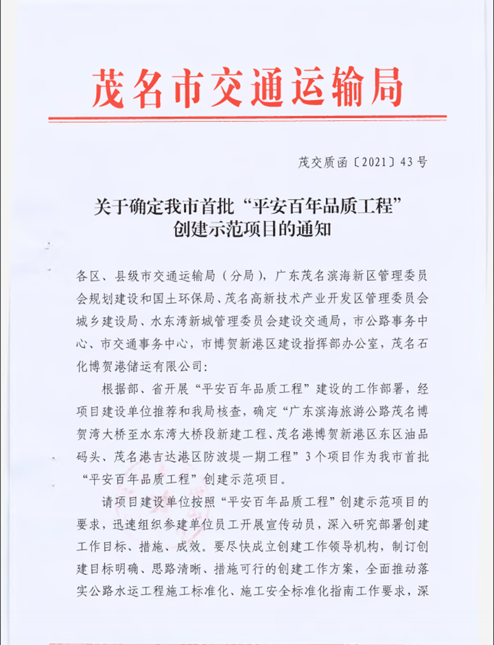 近日,茂名市交通運輸局在全市公路水運項目中開展“平安百年品質(zhì)工程”創(chuàng)建示范工作。經(jīng)過層層選拔,茂名港博賀新港區(qū)東區(qū)油品碼頭工程脫穎而出,成為茂名市首批“平安百年品質(zhì)工程”創(chuàng)建示范項目!