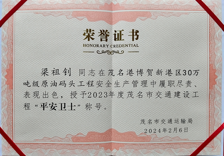 4月12日,茂名市交通運輸局召開全市公路水運工程平安工地建設(shè)交流現(xiàn)場會,總結(jié)2023年全市公路水運工程平安工地建設(shè)工作,交流平安工地建設(shè)的經(jīng)驗和體會。茂名市交通運輸局總工程師張武出席會議并對獲評2023年度市級“平安工地”的3個典型項目和“平安衛(wèi)士”的19名同志進行表彰。茂名港博賀新港區(qū)30萬噸級原油碼頭項目榮獲平安工地建設(shè)典型項目,項目經(jīng)理梁祖釗榮獲茂名市交通建設(shè)工程“平安衛(wèi)士”稱號。