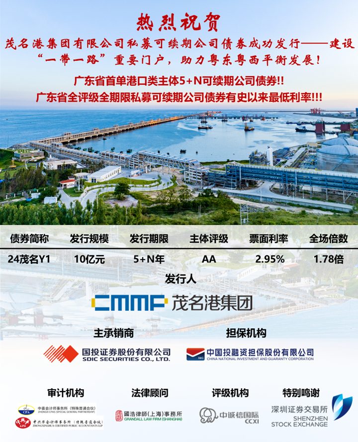 2024年8月28日,茂名港集團有限公司2024年面向?qū)I(yè)投資者非公開發(fā)行可續(xù)期公司債券(第一期)在深圳證券交易所成功發(fā)行。本期債券發(fā)行規(guī)模10億元,債券期限5+N年,發(fā)行利率2.95%,全場認購倍數(shù)達1.78倍,由國投證券股份有限公司擔(dān)任主承銷商及簿記管理人,由專業(yè)擔(dān)保機構(gòu)中國投融資擔(dān)保股份有限公司(主體評級AAA)作為擔(dān)保人,是廣東省首單港口類主體5+N可續(xù)期公司債券,發(fā)行利率創(chuàng)廣東省全評級全期限私募可續(xù)期公司債券有史以來最低利率。