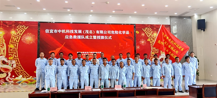 8月12日,集團下屬企業(yè)中機科技發(fā)展(茂名)有限公司(以下簡稱“中機科技公司”)舉行危險化學(xué)品應(yīng)急救援隊成立暨授旗儀式。信宜市安全生產(chǎn)委員會、市應(yīng)急管理局相關(guān)領(lǐng)導(dǎo)出席儀式并為救援隊授旗。